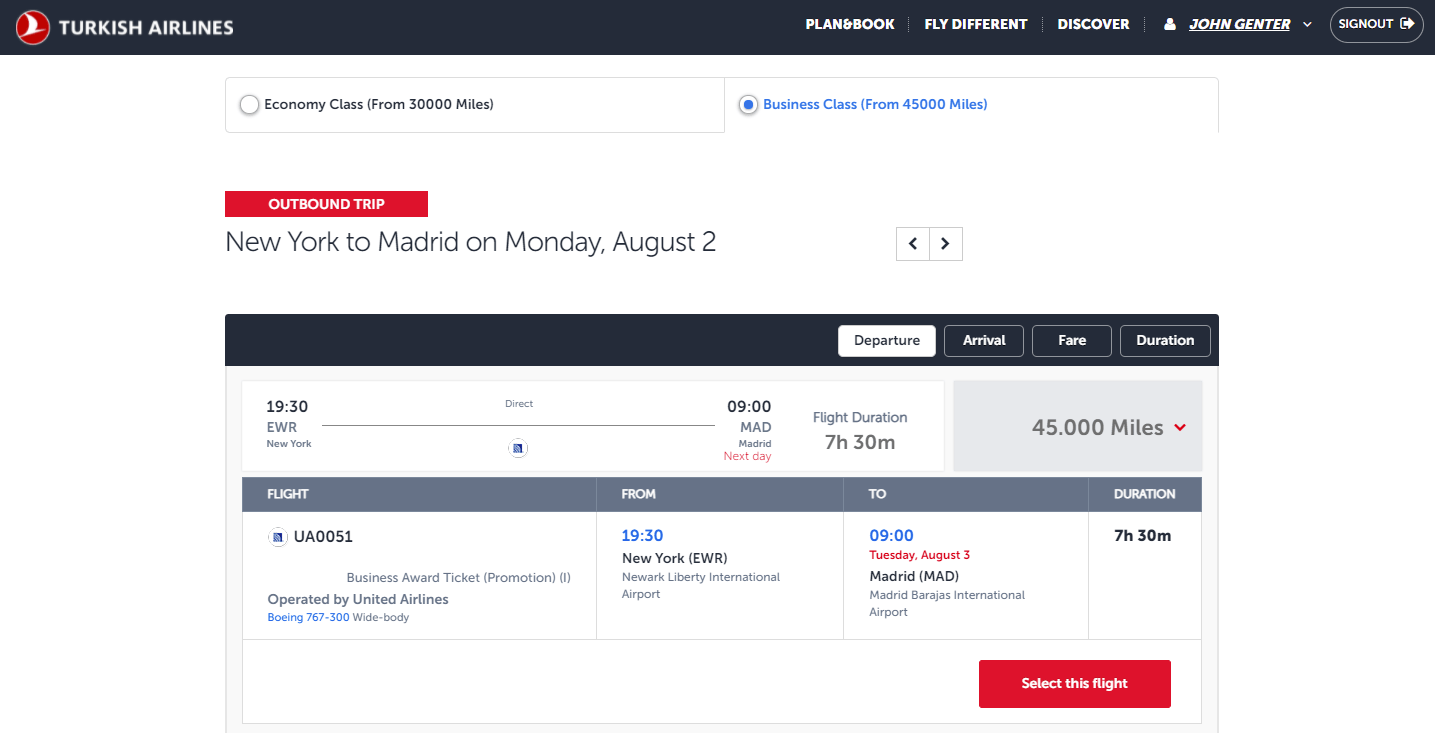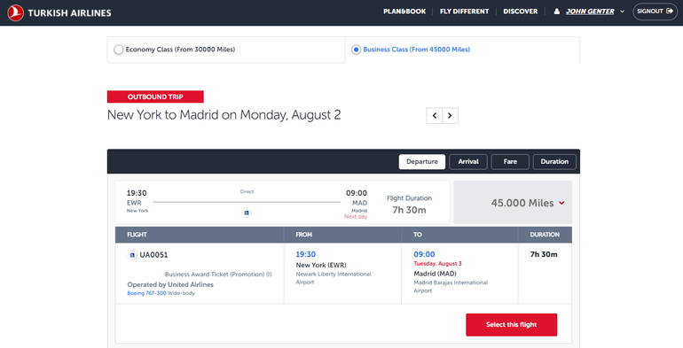 Turkish Airlines' Miles & Smiles loyalty program offers economy award rates that aren't anything special — you'll have to pay 30,000 miles each way for economy tickets. However, Turkish Airlines charges just 45,000 miles each way for a United business class fare between the U.S. and Europe.
