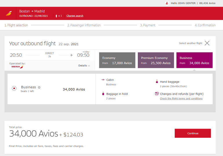 For example, you can book an award flight during the peak summer season from New York-JFK to Madrid. Iberia's eonomy class (also called Blue) will run you as little as 20,000 Avios each way, whereas the airline's premium economy class will cost you 35,000 Avios one-way.