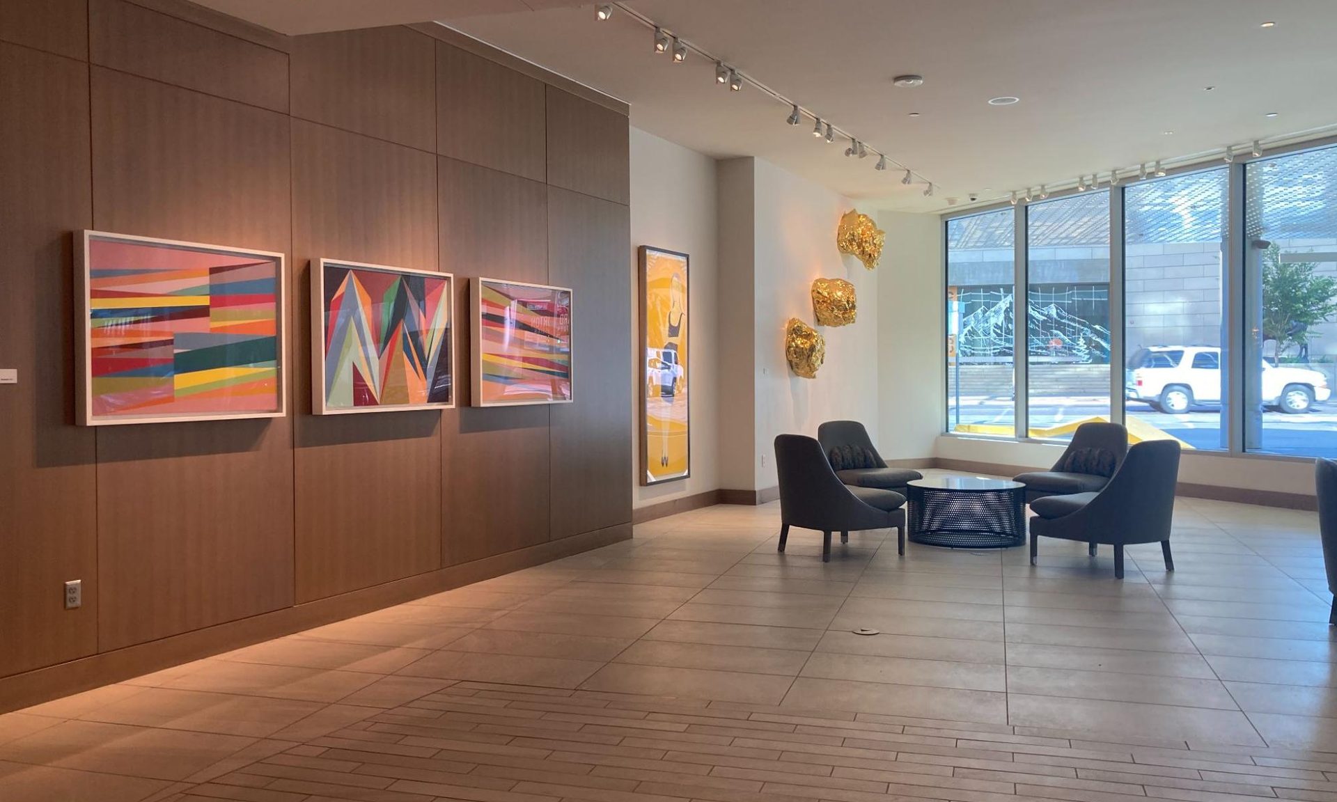 The lobby of The Art Hotel Denver, Curio Collection is referred to as the Portico Gallery. It was curated by Dianne Vanderlip of the Denver Art Museum. (Photo by Sally French)