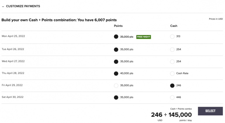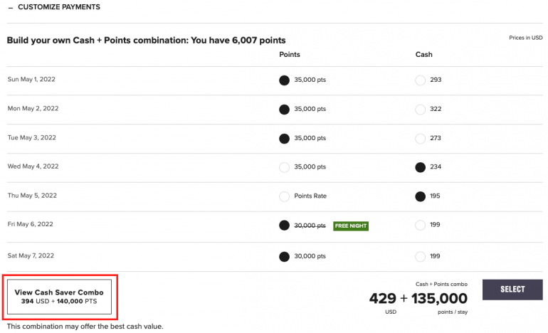 However, by choosing to customize and combine your payments instead, you're able to pay cash for the cheapest of these nights and still receive a free award night, thereby saving yourself nearly $70 on your stay.