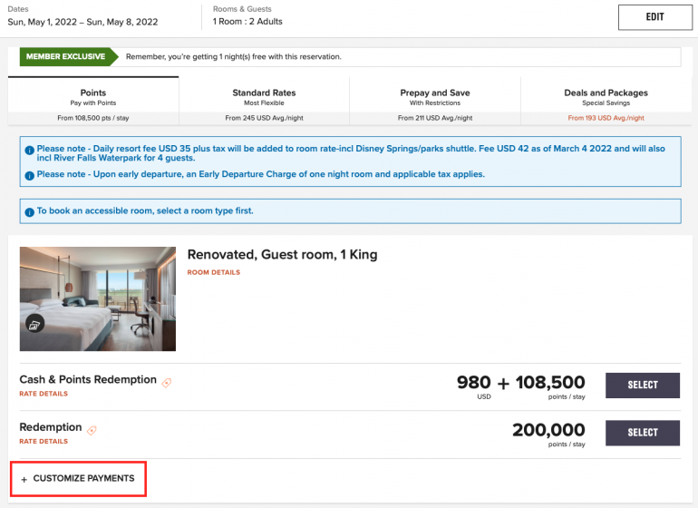 Once you've selected your hotel, you'll be taken to a page showing you the individual charges for your hotel. Here you'll want to select "Customize Payments."