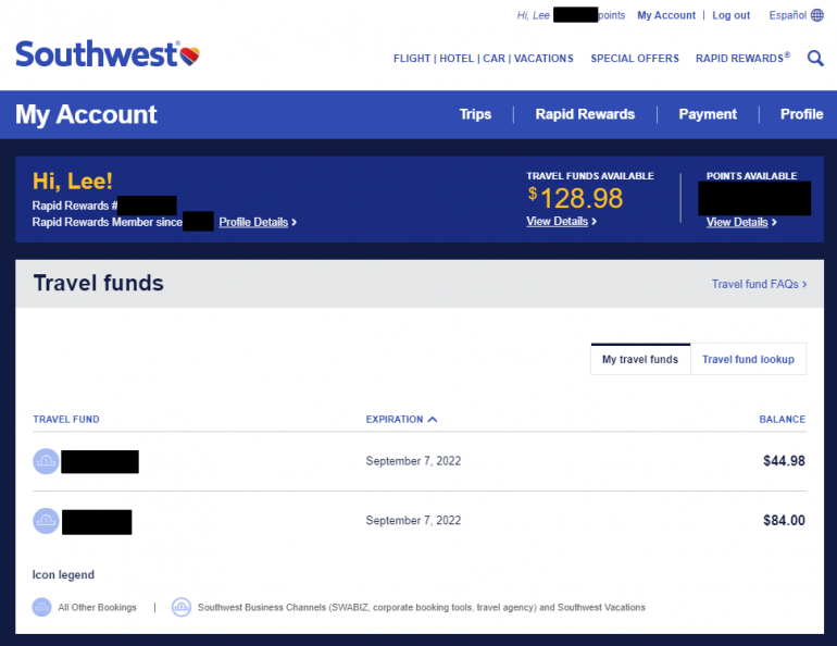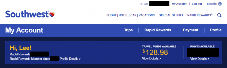 When you log in to your Rapid Rewards loyalty account, your travel funds appear at the top of the "My Account" screen.