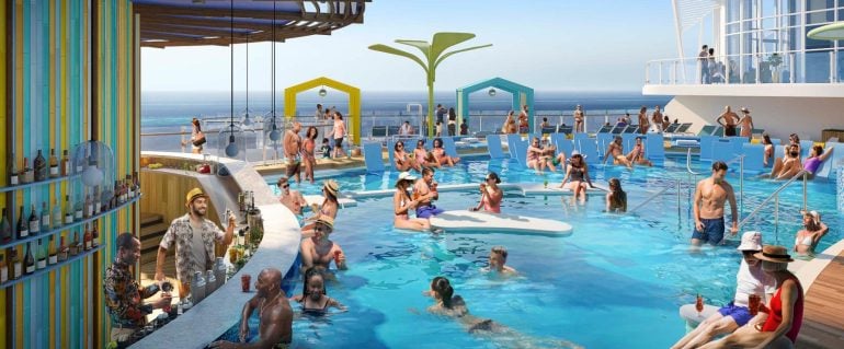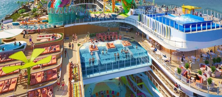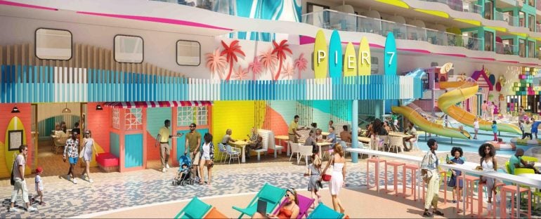 Located on Deck 7 aft, Surfside is specially dedicated to families, offering splash areas for younger kids with fountains, water cannons and more — plus kid-friendly eateries and a separate pool for the parents.
