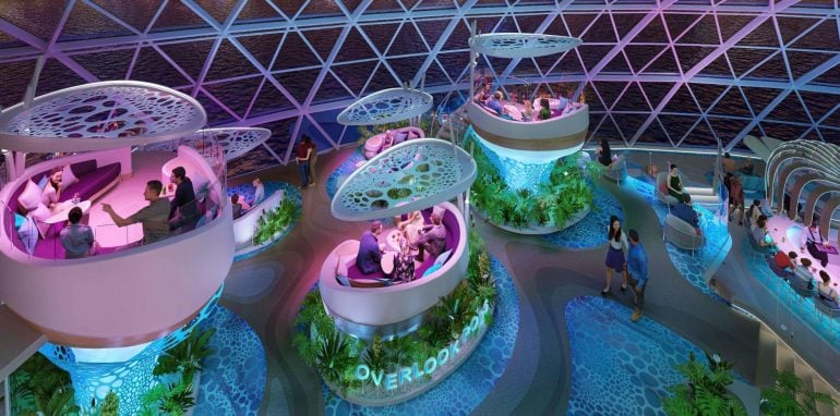 Along with the typical offerings such as a jazz venue, a coffee shop and a casino, one of our favorite architectural features are these Overlook Pods in the AquaDome neighborhood.