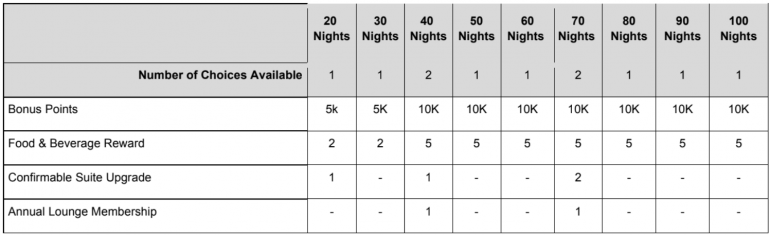 At 30 nights, you'll get another choice. This time between 5,000 bonus points or two food and beverage rewards.