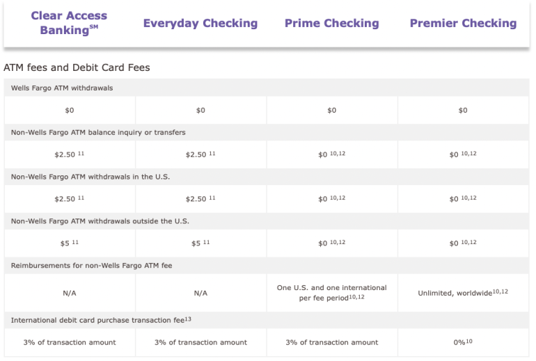 Wells Fargo international ATM fees cost $5 for two of their checking accounts — Clear Access and Everyday checking — while Wells Fargo Prime and Premier account holders pay $0.