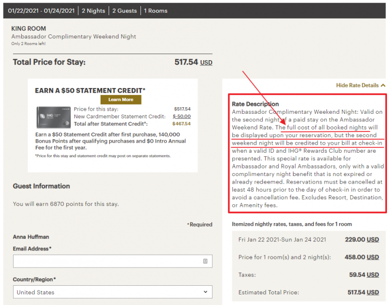 When you book your Ambassador free night, don't be alarmed if the full price is listed on your reservation. The second night will be manually adjusted and credited to your bill so that you're not charged for it.