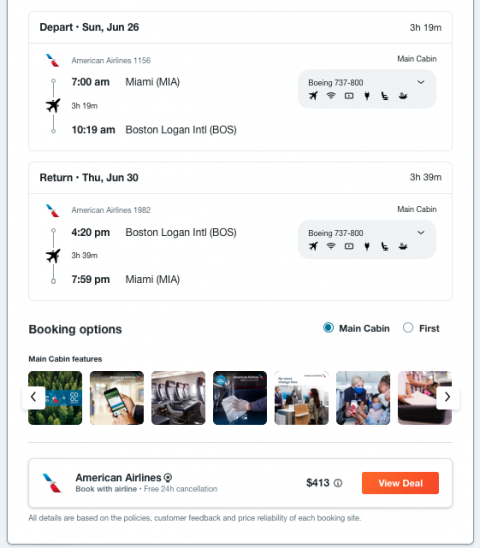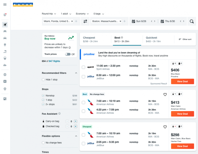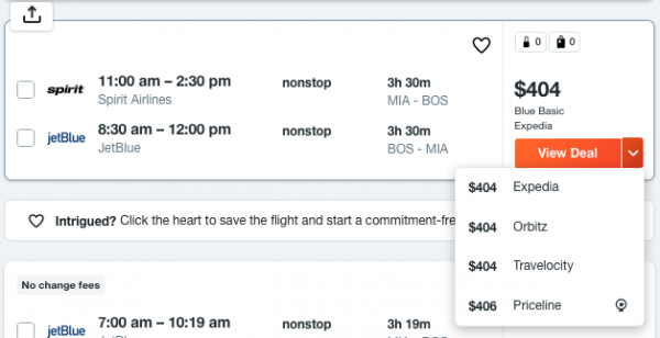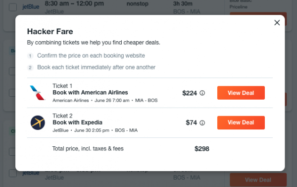 It sounds like cheating, but these fares are legit. They usually occur when Kayak finds a great deal on a round-trip flight by utilizing multiple airlines. For example, the cheapest round-trip flight Kayak found from Miami to Boston was a departing flight on American Airlines and a return flight on JetBlue Airways booked through Expedia.
