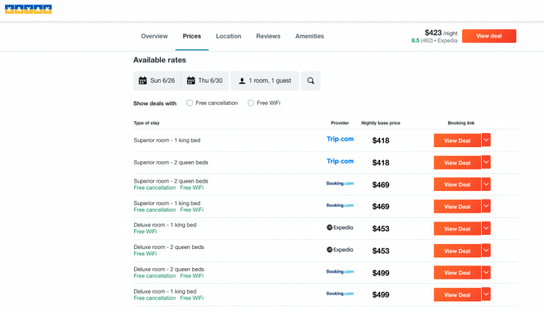 Booking a hotel works about the same way. Perform your search, browse the list of available options, then click on the property listing to see more details and prices across multiple platforms. Click “View deal” to be taken directly to the booking page on the site with the best price. There, you may be shown similar properties for even more booking options.