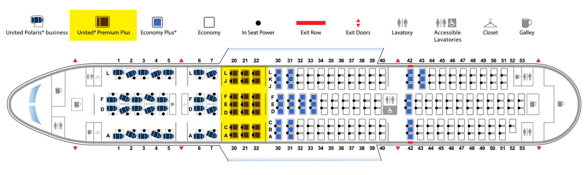 United Premium Plus seats are right behind the United Polaris business class cabin. The layout is a 2-4-2 configuration on Boeing 777-300ER and 777-200 aircraft, a 2-3-2 configuration on Boeing 787 aircraft and a 2-2-2 configuration on Boeing 767-300ER and 767-400ER aircraft.