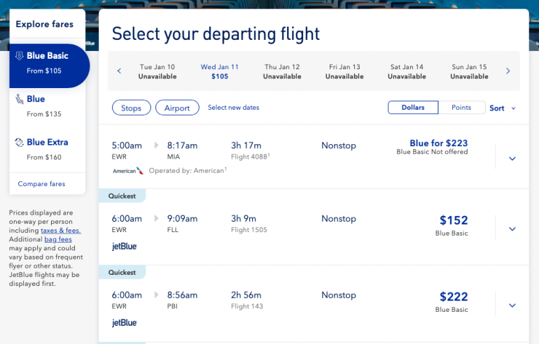 If you’re looking for other types of fares, you can toggle the search results on the left side of the page. Here you can compare Blue Basic versus Blue Plus, Blue Extra or Blue to see pricing and what each tier offers.