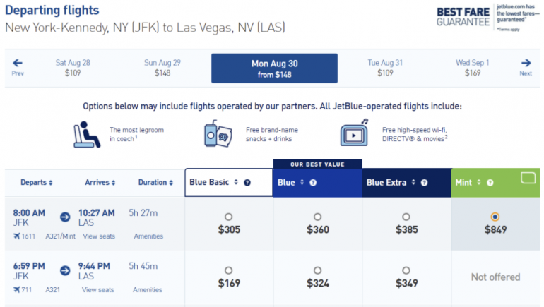 You can now book JetBlue Mint award flights, like from Boston to St. Maarten, for 40,000 Emirates Skywards each way. Or, book JetBlue Mint from New York to Las Vegas for 52,000 Skywards miles each way. Booking that same first class flight from New York to Las Vegas through JetBlue costs $849 or 77,600 TrueBlue points one-way.