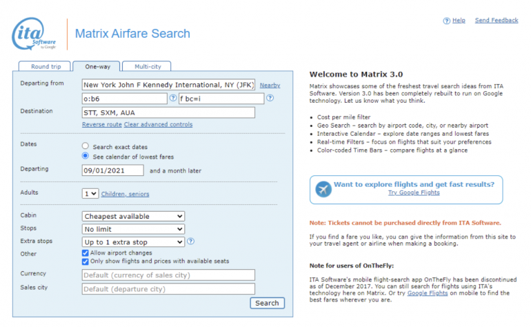 To start, enter the origin and destination airports. Add commas between locations to search multiple destinations. For example, you can search routes from New York-JFK to St. Thomas, St. Maarten and Aruba at the same time.