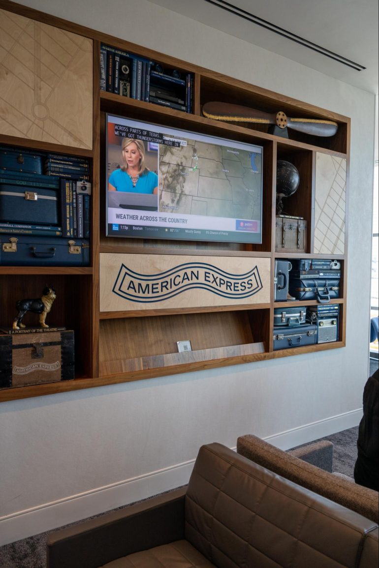 A TV inside a seating area at the Centurion Lounge at JFK. (Photo by Elina Geller)