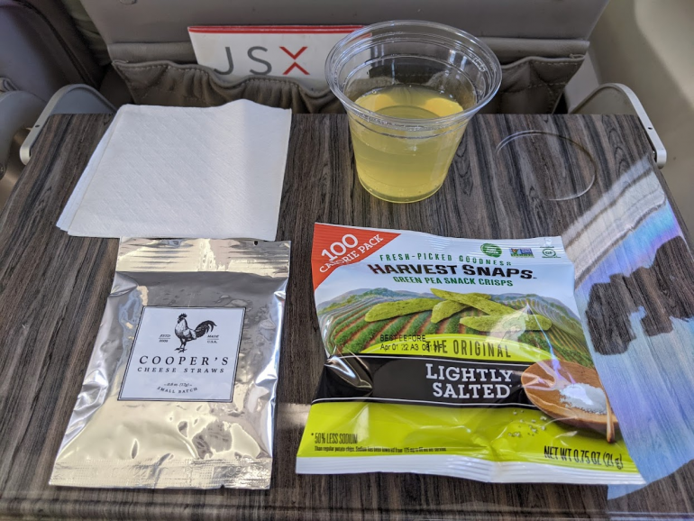The flight attendant served drinks and snacks during the 43-minute flight. The plastic cups and packaged snacks from a snack basket felt a bit short of what you might expect when flying private. But for the price I paid, it was perfectly fine. No additional drinks or snacks were offered.