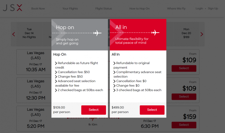 JSX offers two types of fares: Hop On and All In. Hop On is JSX's cheaper fare type — with fees for changes, cancellations and seat assignments. Upgrade to an All In fare to gain the flexibility to change or cancel your ticket without fees.