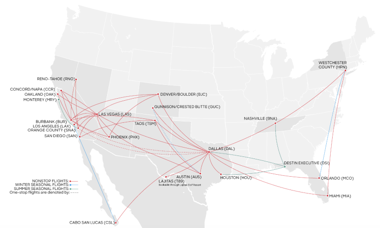 JSX services more than 20 destinations, which include Cabo San Lucas, Dallas, Houston, Austin, Miami, Westchester County, Nashville, LAX, Las Vegas, Denver, Crested Butte, Oakland and Phoenix. Together, those flights make up about 750 flights weekly. While that's tiny compared to the traditional carriers, it does have a reasonably large footprint.