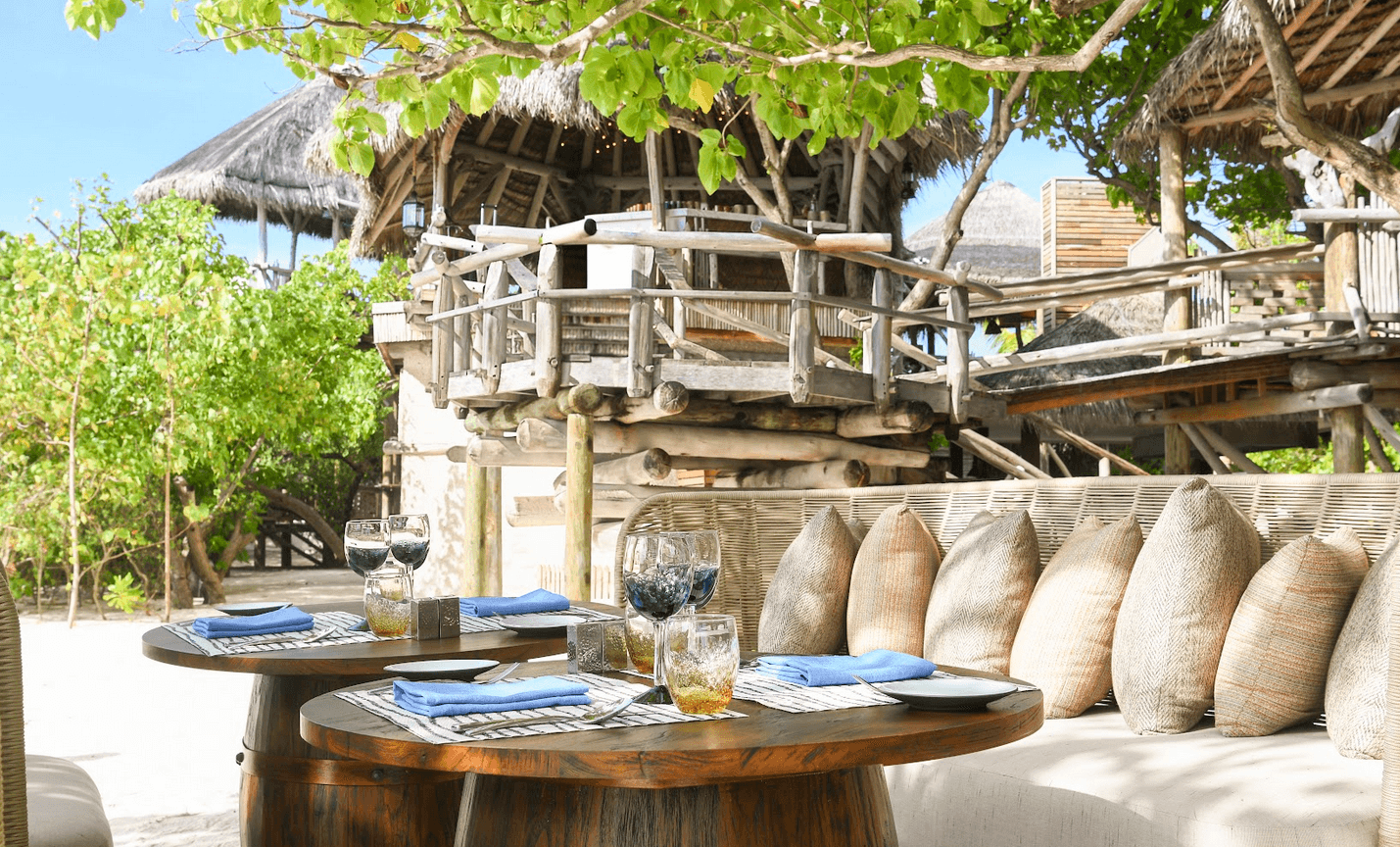A Thai restaurant, Kaashi, has beach seating and a treehouse setup where diners can enjoy an aerial view of the island. The open-plan kitchen prepares a variety of fragrant Thai dishes that are paired with craft cocktails.