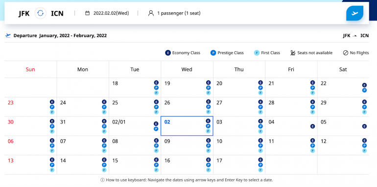 Searching for Korean Air first class availability is straightforward. Login to your Korean Air Skypass account. Select "Award" on the right side of the webpage, fill out your flight details and click the light blue airplane logo below "All Class."
