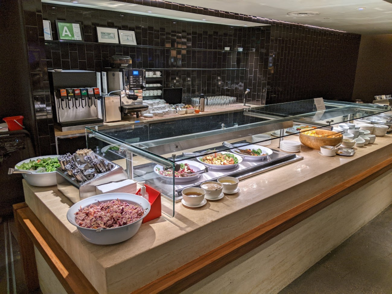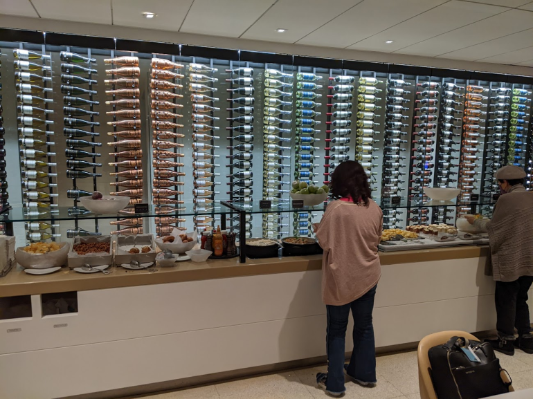 The main downside of this lounge is the food, which is a bit lacking compared with other lounges on this list (although the backdrop of wine and champagne bottles makes the buffet look visually stunning).