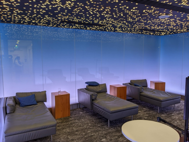 Six elegant shower rooms are stocked with Saks Fifth Avenue towels, slippers, and Sunday Riley amenities. And if you're battling jet lag, you can take advantage of one of the lounge's private nap rooms.