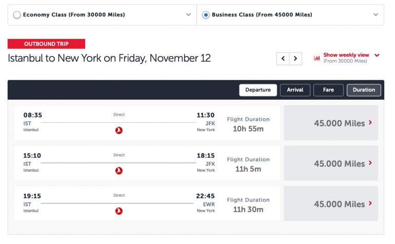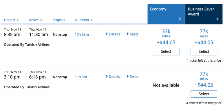 A business class flight on Turkish Airlines costs more in United miles than it does in the airline’s own currency, but you’ll be able to search on the United website easily to see available flights.