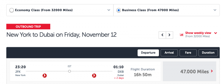 Second, flying Turkish business class to Middle East destinations costs only slightly more miles than flying to Turkey: just 2,000 miles more — 47,000 total — on a recent search for a New York-to-Dubai business class flight on Turkish Airlines.