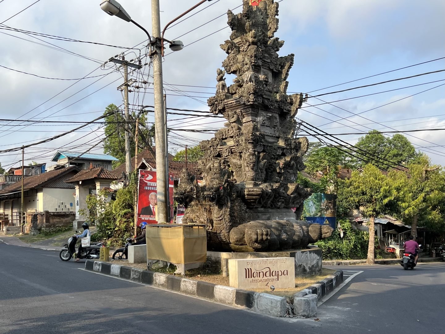 A small sign in the middle of an intersection points to the Mandapa entrance. (Photo by Benjamin Din)