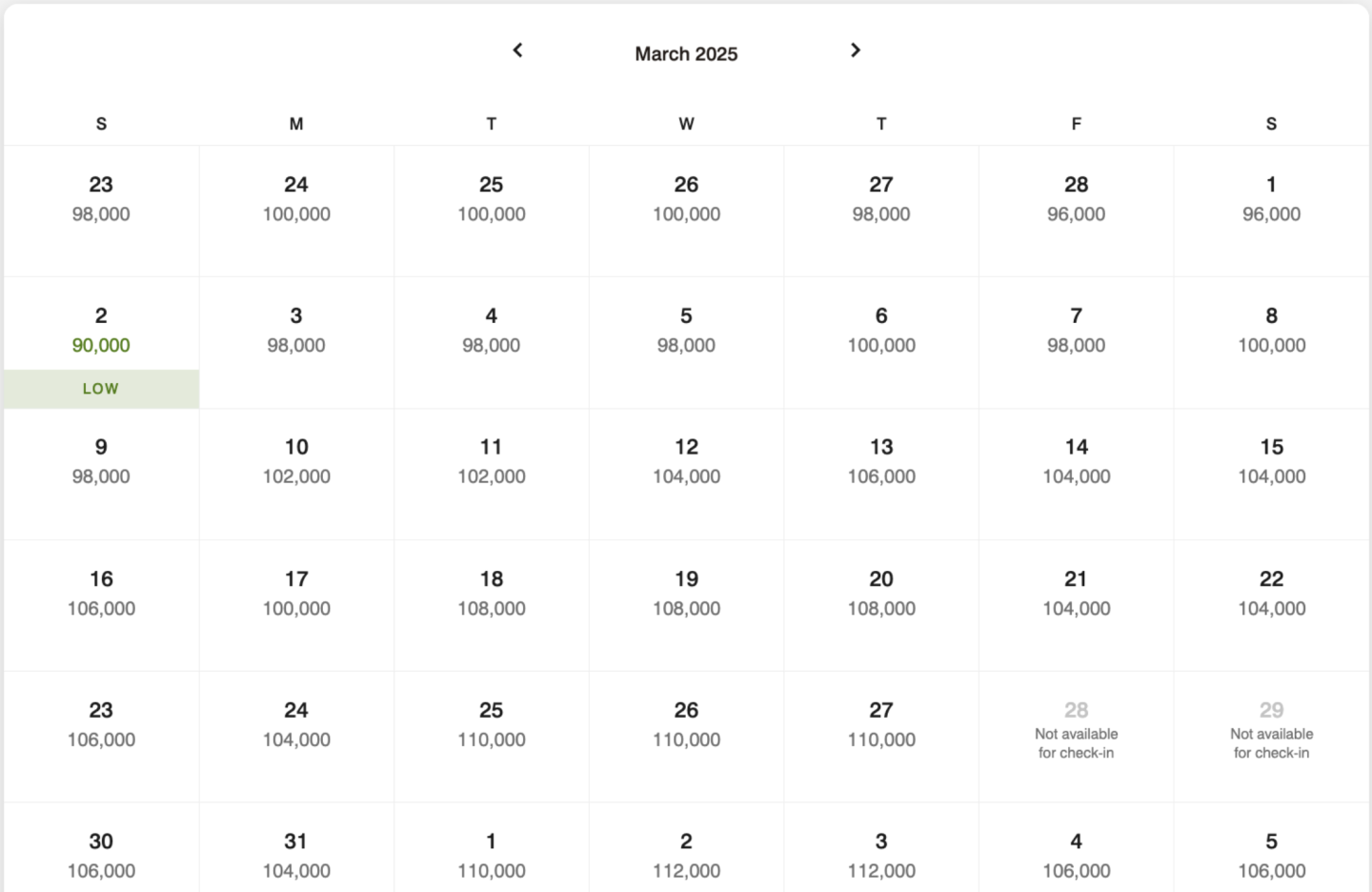 The points calendar for March 2025 shows multiple nights costing 100,000 Marriott points or fewer.