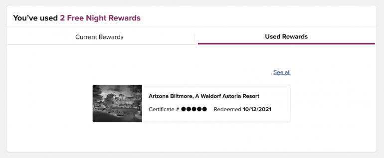 To see if you have any available free night certificates, log in to your account on the Hilton website. The main page, select the “Profile” option from the menu bar at the top. Scroll down, and you’ll see a section that lists any available free night rewards and — if applicable — rewards to an upcoming stay.