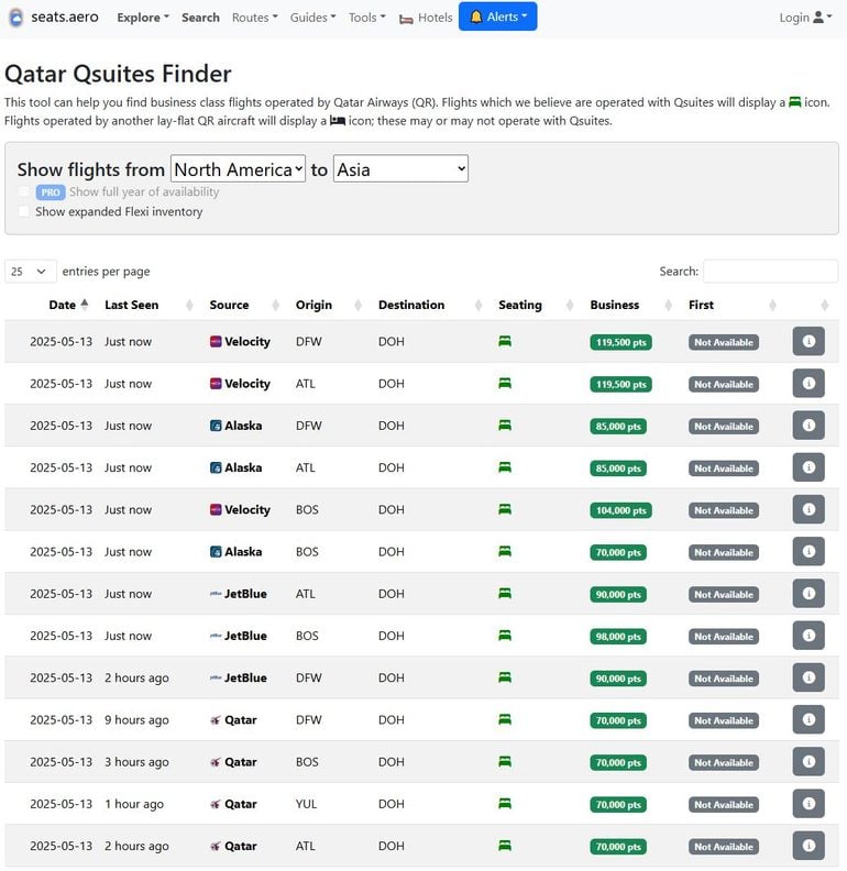 Seats.aero is my favorite tool for finding premium cabin award space across a wide range of dates and airports for aspirational redemptions like Japan Airlines first class, Qatar Airways Qsuites and Etihad apartments. Pro users can search over an entire year for availability, and all users can filter by regions, such as North America and Europe.