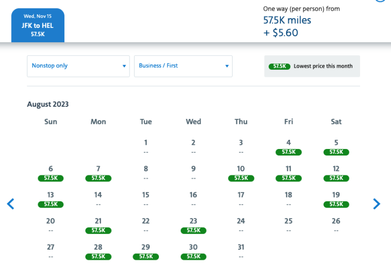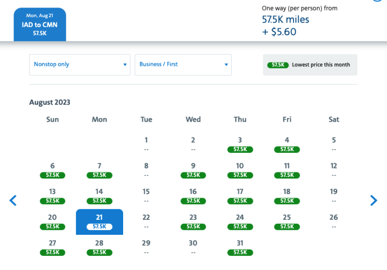 American partner Royal Air Maroc offers U.S. nonstop service only from Miami, New York-JFK and Washington-Dulles to its hub in Casablanca, Morocco. But the North African carrier features the same solid 57,500-mile pricing as its European partners. Again taking August as an example, availability from Washington-Dulles to Casablanca was wide open at last check: