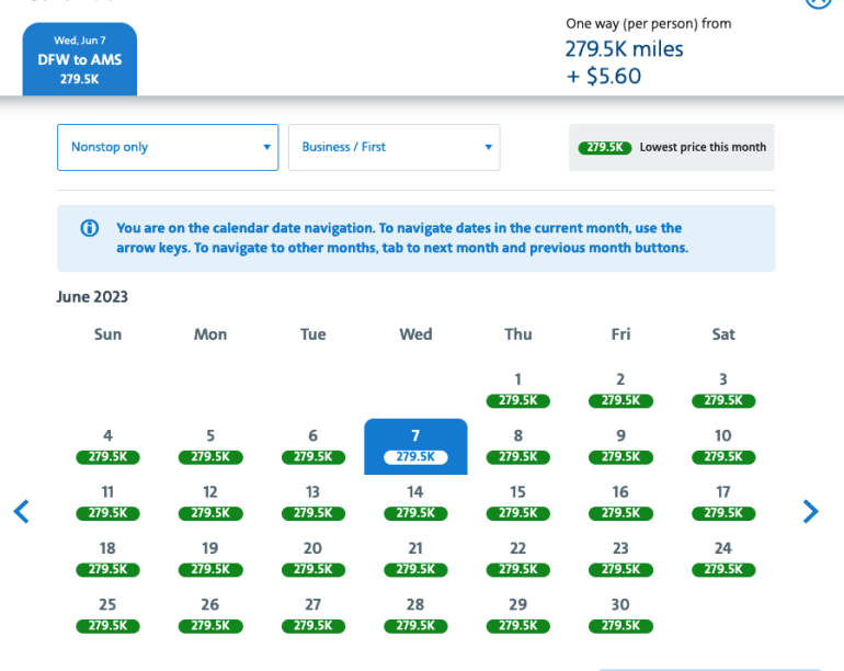 American has turned to dynamic pricing for its own flights, which basically means it’s impossible to predict exactly how many miles you’ll pay. Contrast that to the partner airline awards above, which stick to a fixed award chart, at least for now. While a U.S. to Europe flight on a Oneworld partner airline will set you back 57,500 American miles, the same flight on American’s own metal could cost you upward of 279,000 miles: