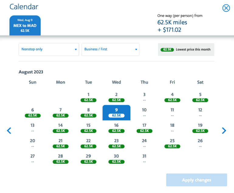 You’ll pay 62,500 American miles each way — standard American partner award pricing from Mexico to Europe — plus around $170 in surcharges. Given how easy it can be to find a flight that works with your travel plans, that’s a decent value.