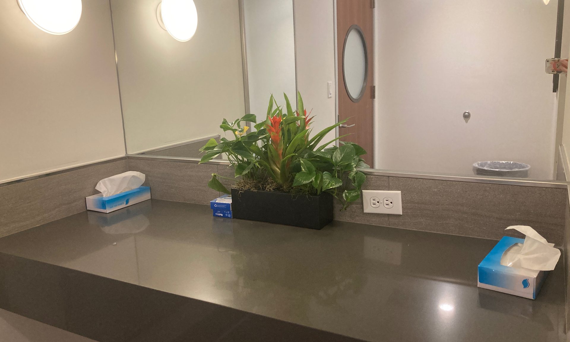 There are some nice touches, including colorful flowers and complimentary feminine care products.