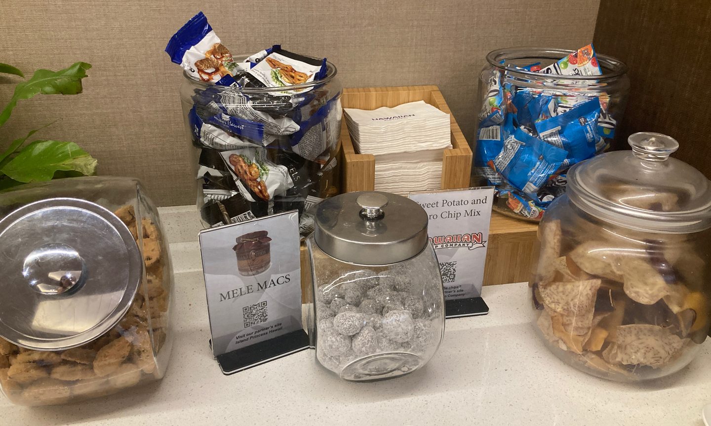 There are also a few types of prepackaged snacks such as pretzels and gummies. Delightfully, though, there are cookie jars with Hawaiian desserts including Honolulu Cookie Company shortbread and Mele Macs macadamia nuts.