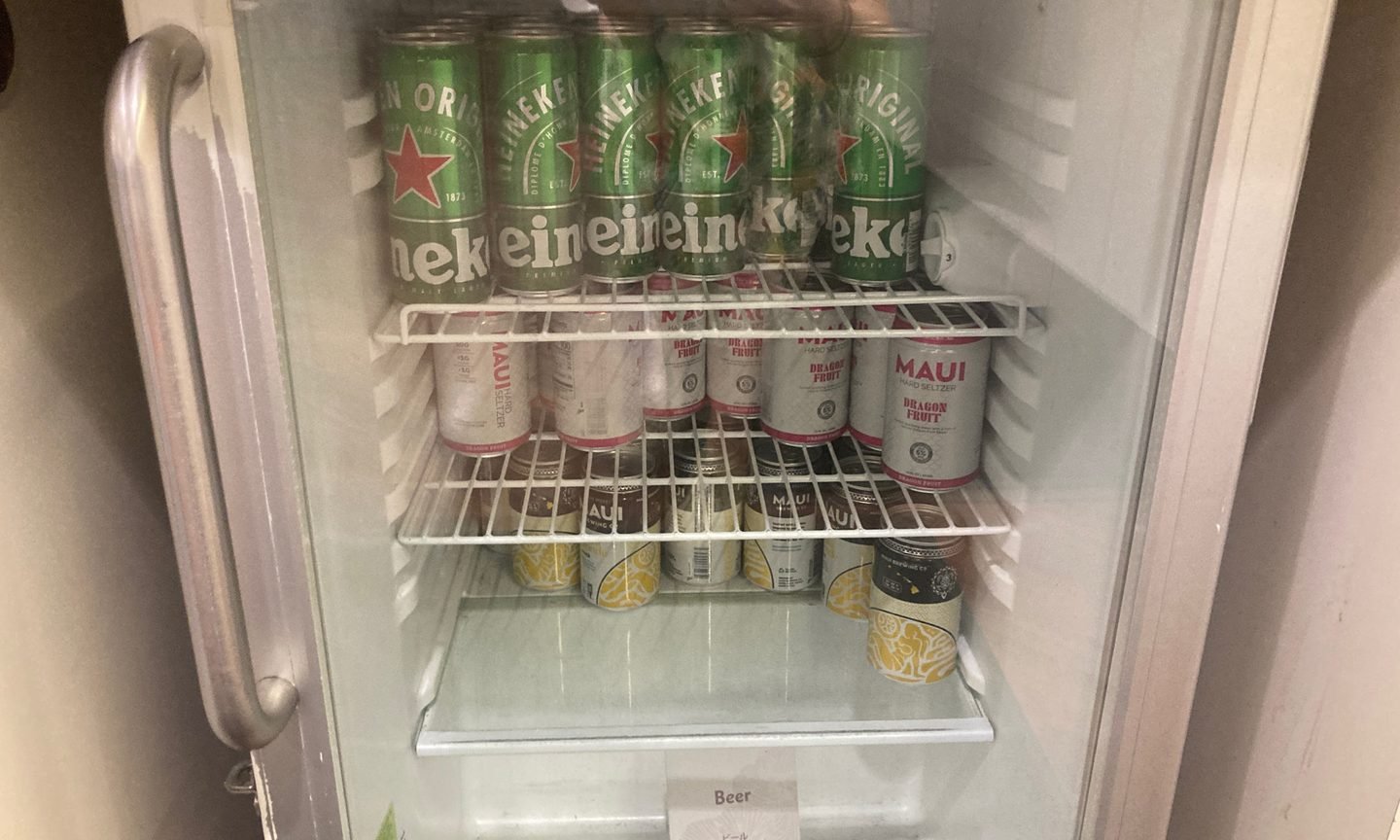 The alcoholic beverages are also self-serve. There are wine bottles on the counter, so you can pour yourself a glass. Or you can grab a beer from the fridge.
