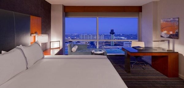 This new San Francisco airport hotel offers incredible views of the international terminal as well as planes from airlines like Qantas, Korean Air and EVA Air parked with their noses facing the hotel at close proximity. Rooms with runway views are redeemable for 20,000 Hyatt points per night. They come with floor-to-ceiling windows through which guests can watch planes take off at SFO.