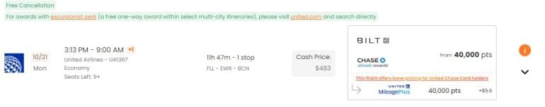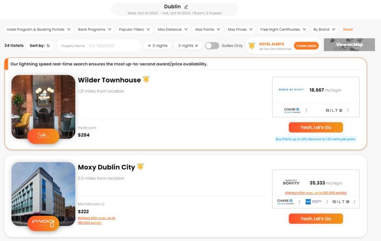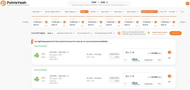 A feature I really like is the ability to see the cash price next to the redemption cost. In the example below from Newark (EWR) to Dublin (DUB), PointsYeah found 3,737 flight options. Of those, 74 are nonstop flights. The cheapest option is to use 22,500 Alaska Mileage Plan miles (which can be transferred from Bilt Rewards) to fly on Alaska's partner airline Aer Lingus, which otherwise would cost $730. With this redemption, you’d effectively get a value of 3.2 cents per mile. Clicking on either the “cash price” or the “mile price” will take you directly to the airline’s website.