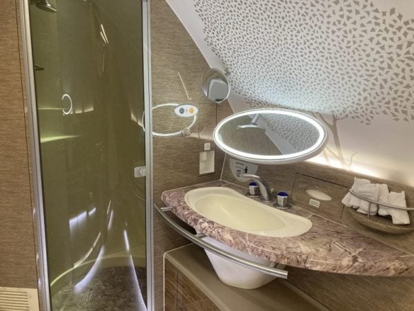 The in-flight shower for passengers in Emirates first class. (Photo by Sally French)