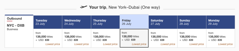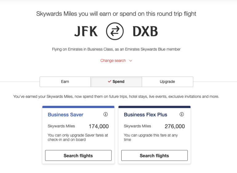Prices are slightly better if you can find award availability on both ways of your journey. Flying round-trip between New York-JFK and Dubai will cost 174,000 miles, a 37% discount off the price of booking two one-way tickets.