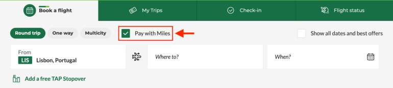 To redeem TAP miles for any flight, you must be a TAP Miles&Go program member. Once logged in to the website, go to My Client Area and click on the “Reserve with miles” button. You also can start the booking process from the homepage.