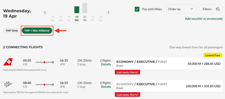 If a route is serviced by TAP and other Star Alliance carriers, you can switch to “TAP + Star Alliance” from the flight results page, and the website will perform a new search.
