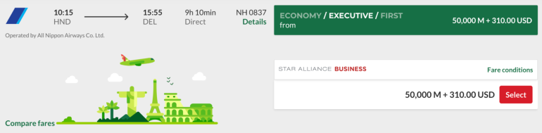 Another sweet spot comes out of Asia, for flights between Tokyo and New Delhi, which clock in at about nine hours in length. A one-way flight in ANA’s business class cabin will set you back 50,000 Miles&Go miles and $310 in cash.