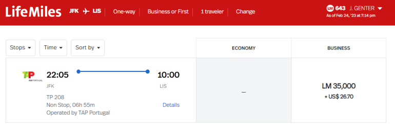 Most Avianca LifeMiles awards between the United States and much of Europe cost 63,000 miles each way. However, at the time of writing, travelers can book TAP Portugal business class from New York-John F. Kennedy to Lisbon for just 35,000 LifeMiles one way.