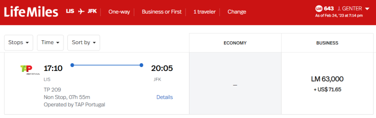 This pricing quirk is limited to this one nonstop route. If you need to connect within the U.S. or Europe, you'll pay standard pricing. Even the route from Lisbon back to New York prices at the standard 63,000 LifeMiles each way.