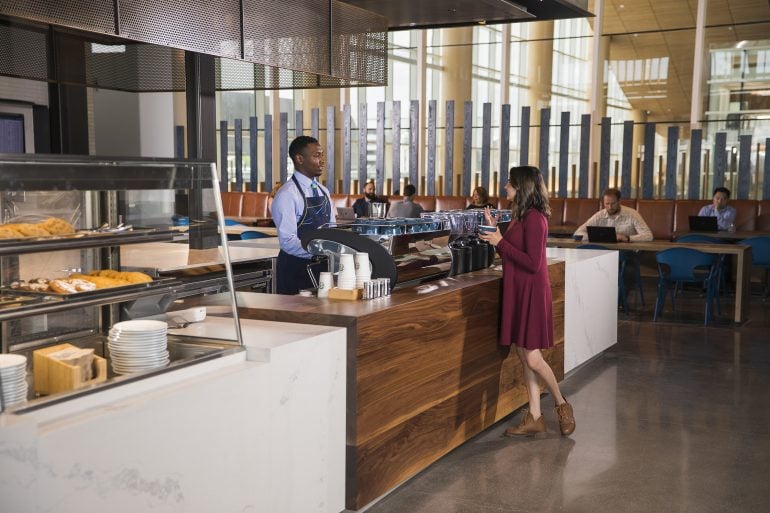 Made-to-order dishes, like flatbread pizzas and salads, are available for purchase. And you’ll find the Alaska Airlines pancake machine “printing” fluffy pancakes throughout the day.
