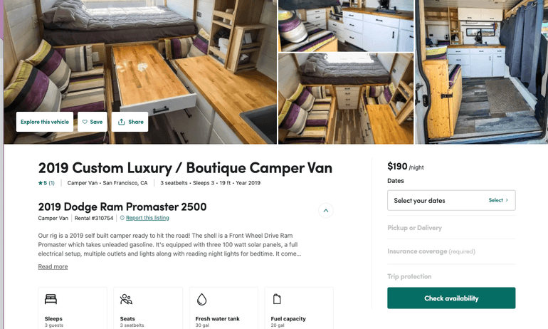 No two vehicles are identical, and rentals often have a unique, owner touch. If you love #vanlife, Outdoorsy is probably the site for you. It has neat listings, like custom, luxury boutique camper vans. You'll find cool amenities — we've seen heated mattresses and top-notch speaker systems. Some rentals come with kayaks and paddle boards included.