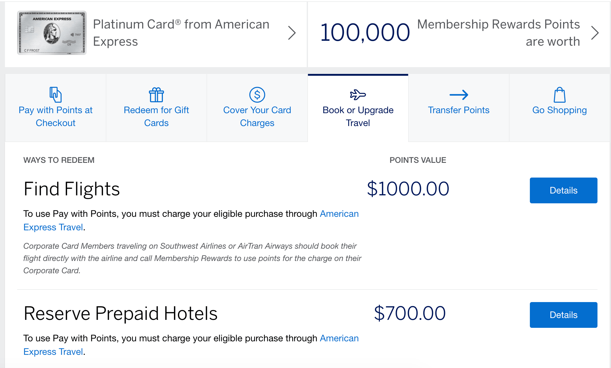 Let’s assume you have 100,000 Membership Rewards points. Because AmEx points are worth 1.6 cents each, those 100,000 points are equivalent to about $1,600. However, when you use American Express Membership Rewards points to reserve prepaid hotels through American Express Travel, your points are worth a paltry 0.7 cents each. That translates into $700 in value toward prepaid hotels when booking a cash rate through the American Express travel portal.