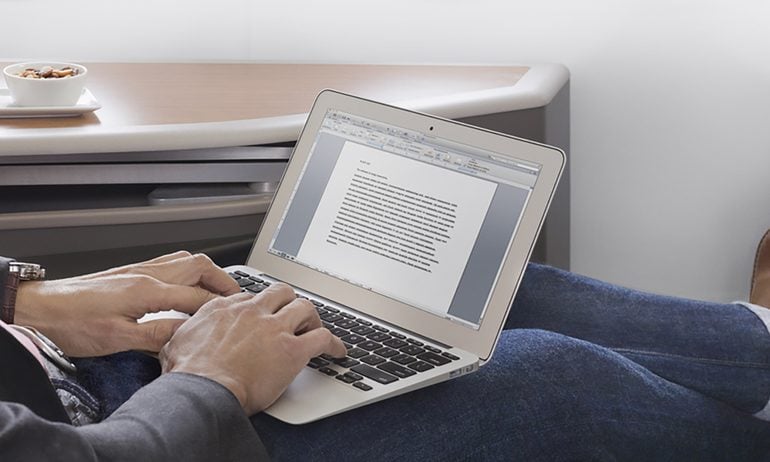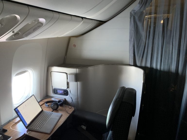 On the Boeing 777-300ER, there are only eight seats, and each swivels to the side so that it can be set up like a desk or small office. This is great if you want to look out the window while you work.